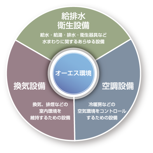建物の高度化、複合化が進むなか、その変化に対応して、冷暖房、換気、排煙など建物の心臓部とも言うべき空調設備の分野を担っています。安全で快適で、健康的な空気環境を実現するために、オーエス環境株式会社ならではのノウハウと技術力で確実に応えてまいります。